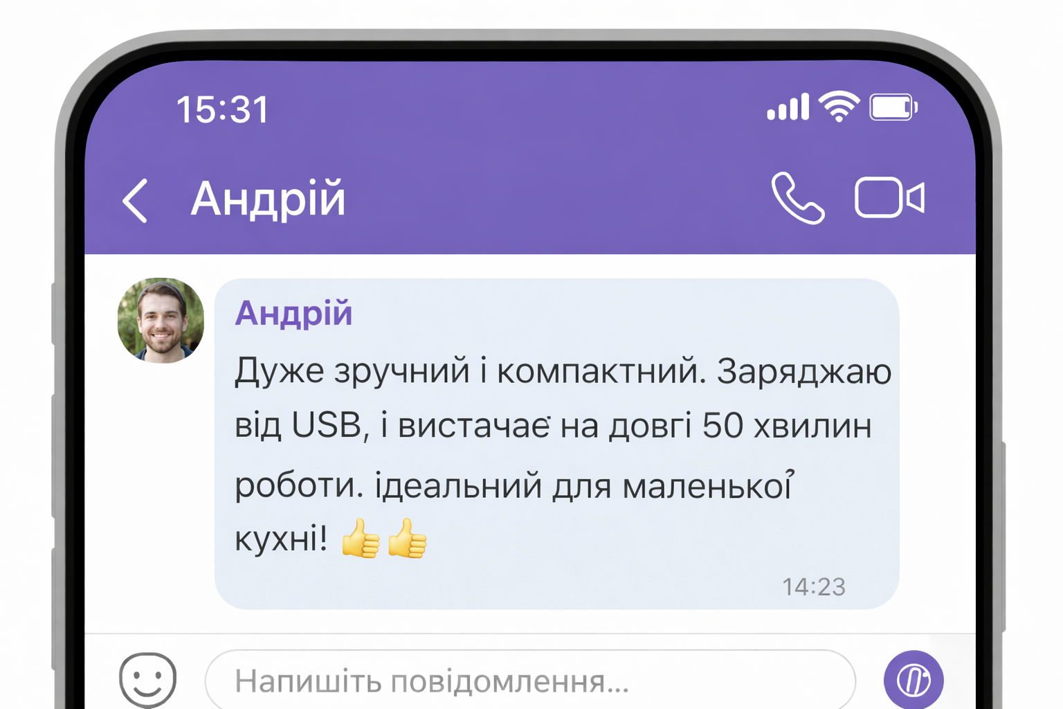 Дуже зручний і компактний. Заряджаю від USB, і вистачає на довгі 50 хвилин роботи. Ідеальний для маленької кухні!